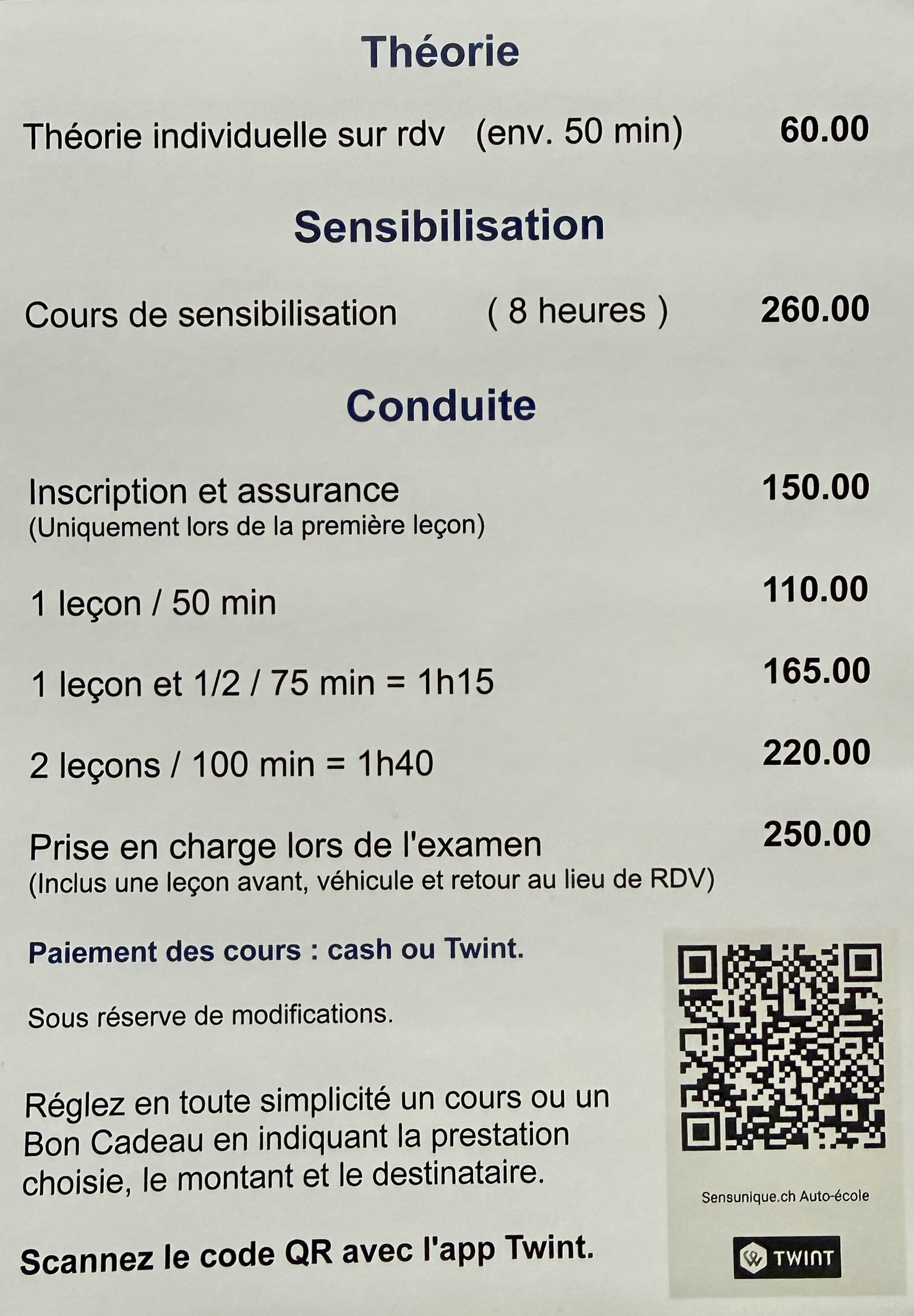 Le prix est le même que les cours de théorie ou pratique donnés à des jeunes conducteurs.
